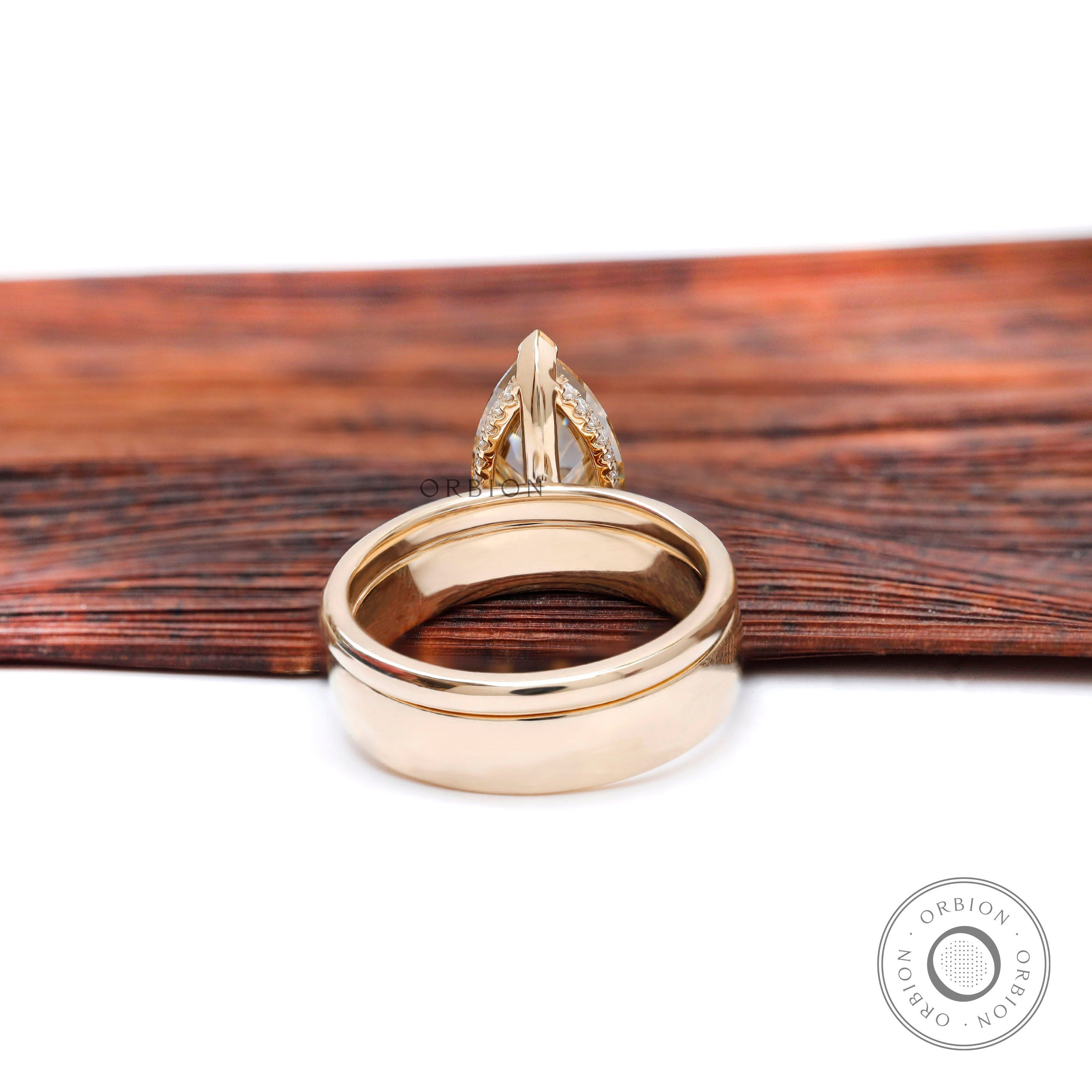 Pear Champagne Moissanite Thick Band Engagement Ring Set Hidden Halo Wedding Set Matching Plain Gold Wide Band 14k Yellow Gold Rings