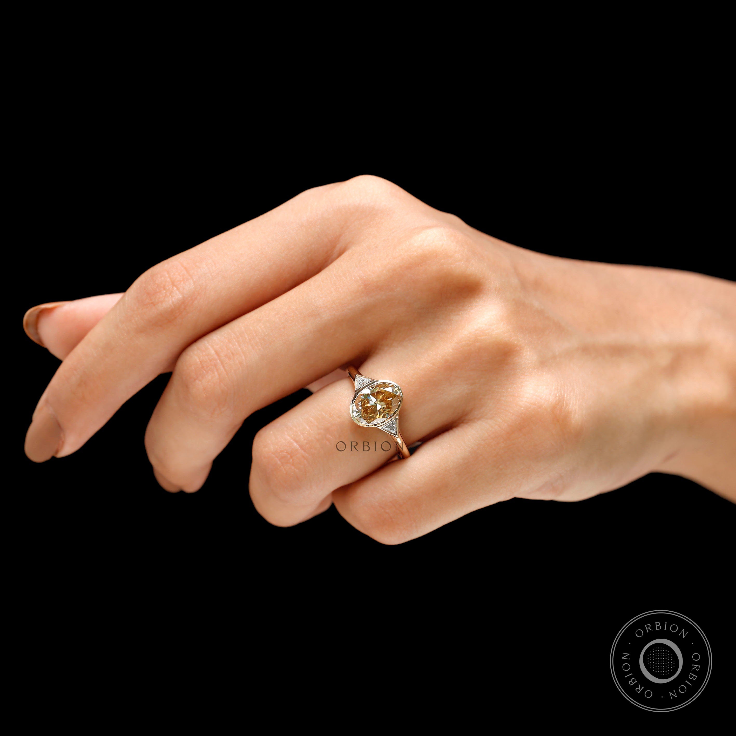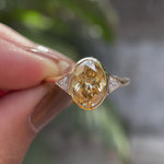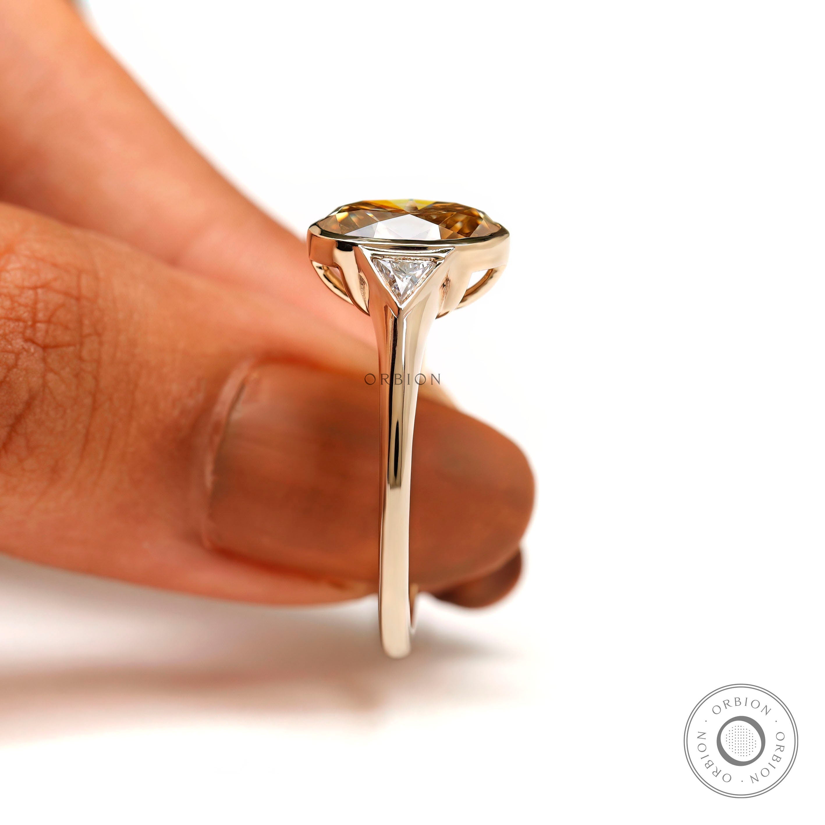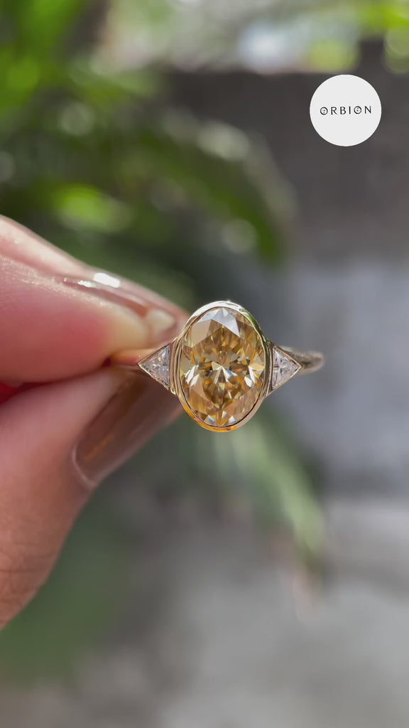 Oval Cut Champagne Moissanite Bezel Engagement Ring Three Stone Wedding Ring Color Moissanite Ring For Women Yellow Gold Anniversary Ring