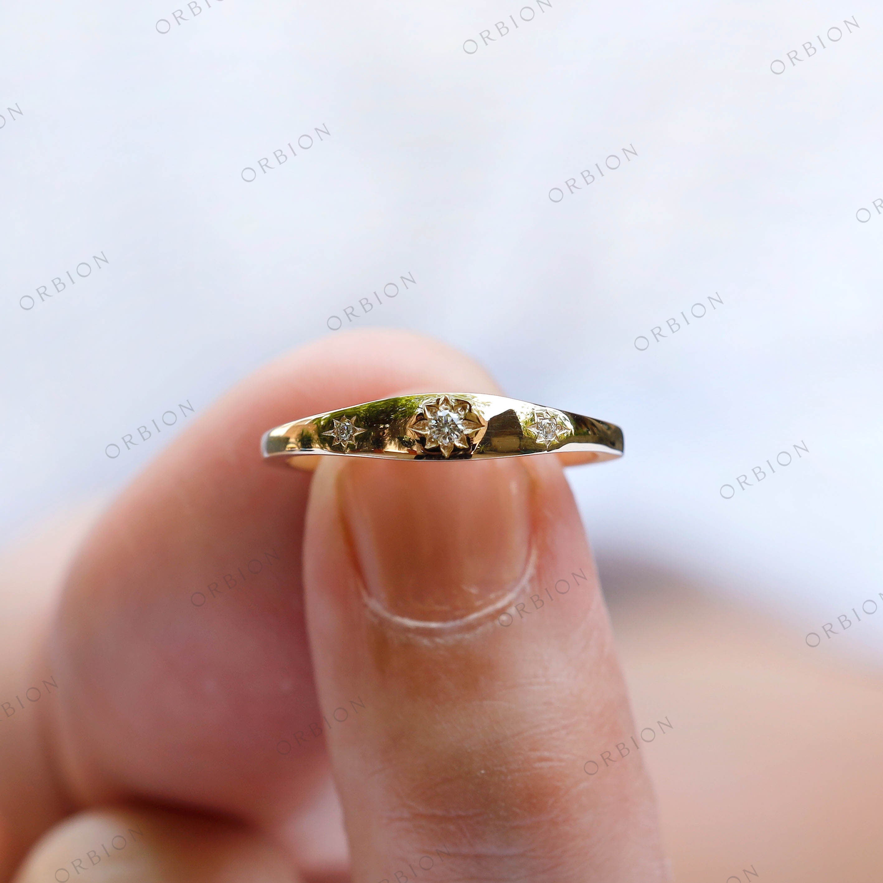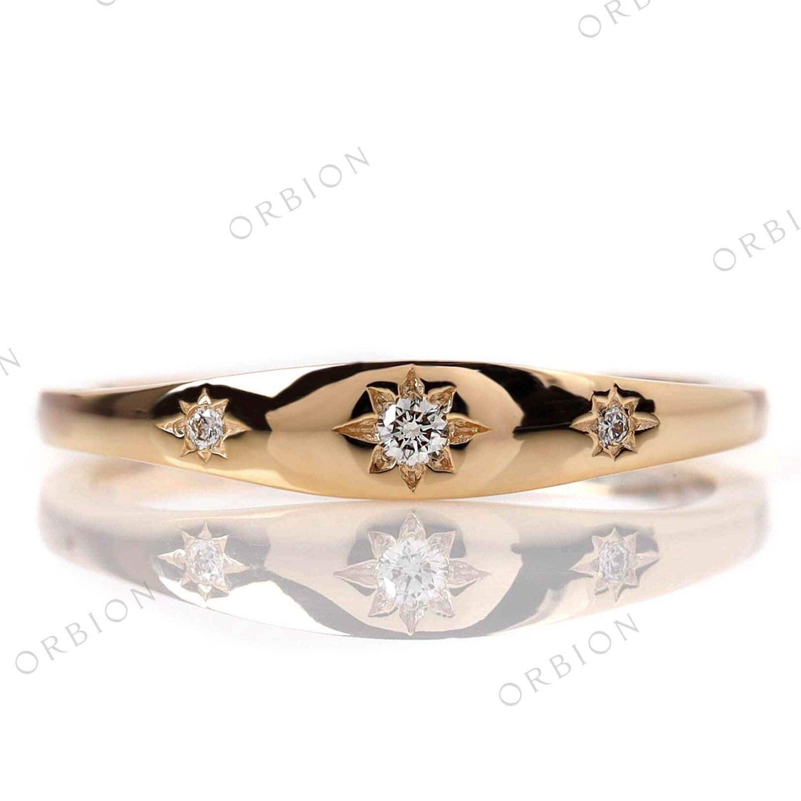 Round Starburst Lab Diamond Band, 14K Gold Wedding Band For Her, Signet Diamond Ring, North Star Celestial Ring, Dainty Diamond Band