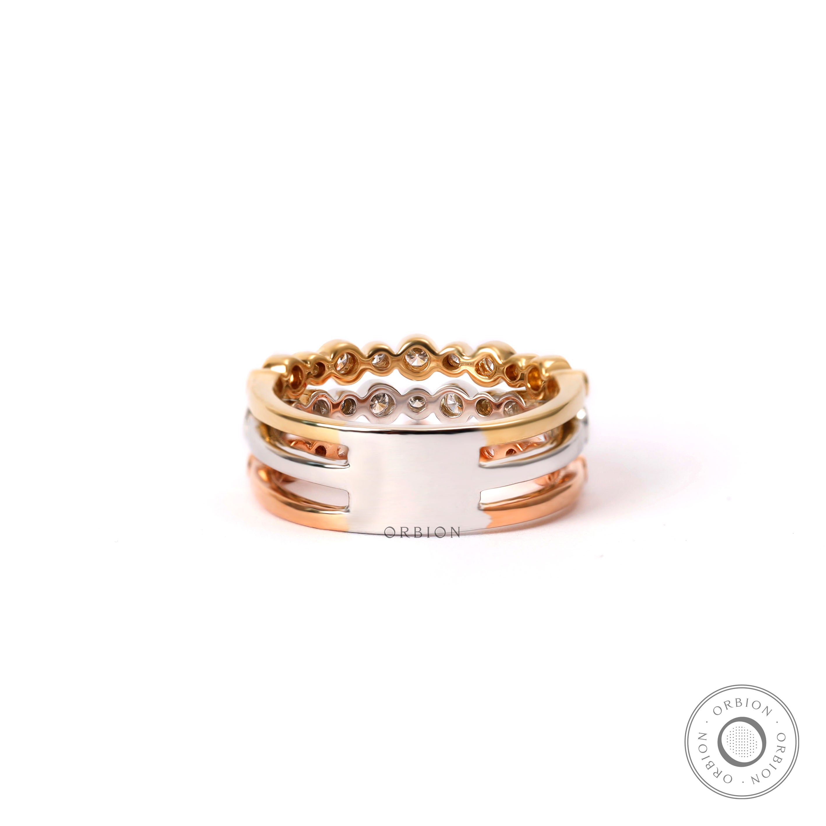 Tri Color Wedding Bands, Tri Color Engagement Ring, Three Tone Ring, Unique Wedding Band, Bubble Diamond Wedding Band, 3 Row Eternity Rings, 3 Row Diamond Ring, Stackable Diamond Band Rings, Stacking Rings For Women, Lab Diamond Band Half Eternity, Bezel Diamond Band