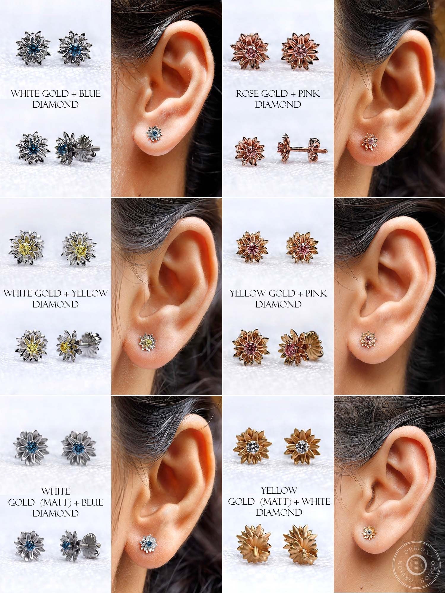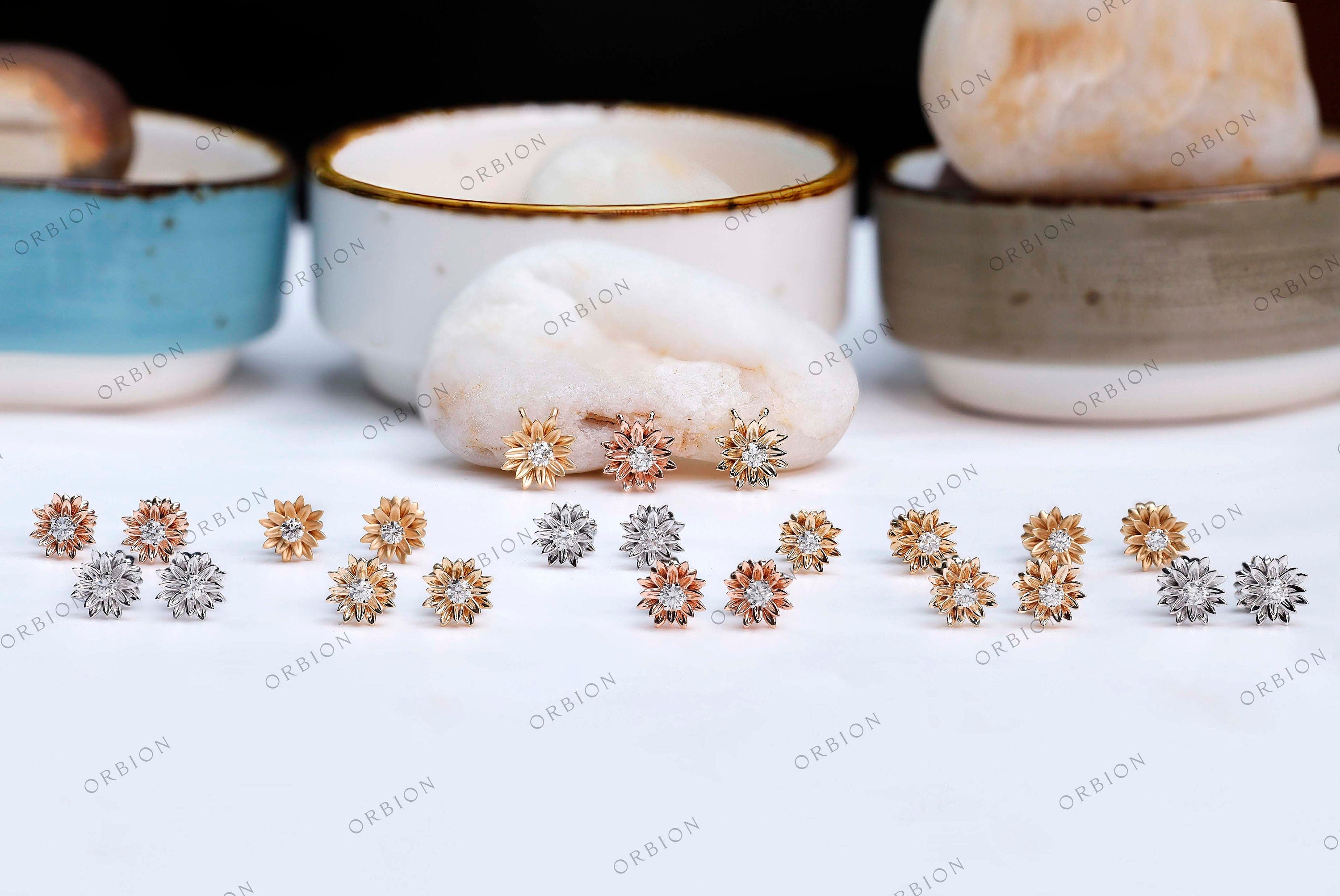 Elevate your jewelry collection with our Lotus-inspired “Majestic Bloom” earrings, adorned with a captivating 2.5 mm round center Lab-Diamonds that mirrors the purity and splendor of the lotus. Available in 10k, 14k, or 18k gold, these earrings offer a personalized touch with Smooth Matte or Glossy finish options.