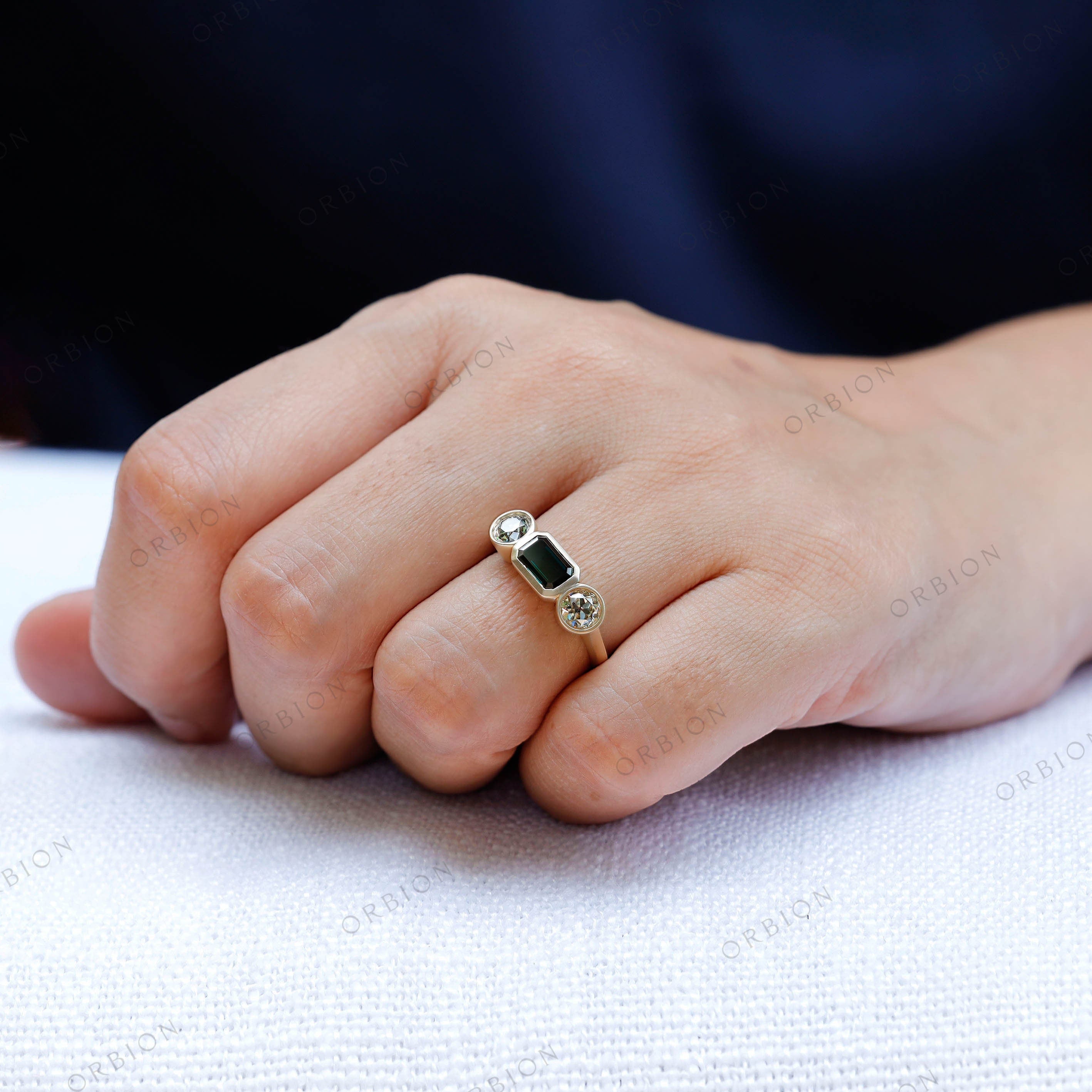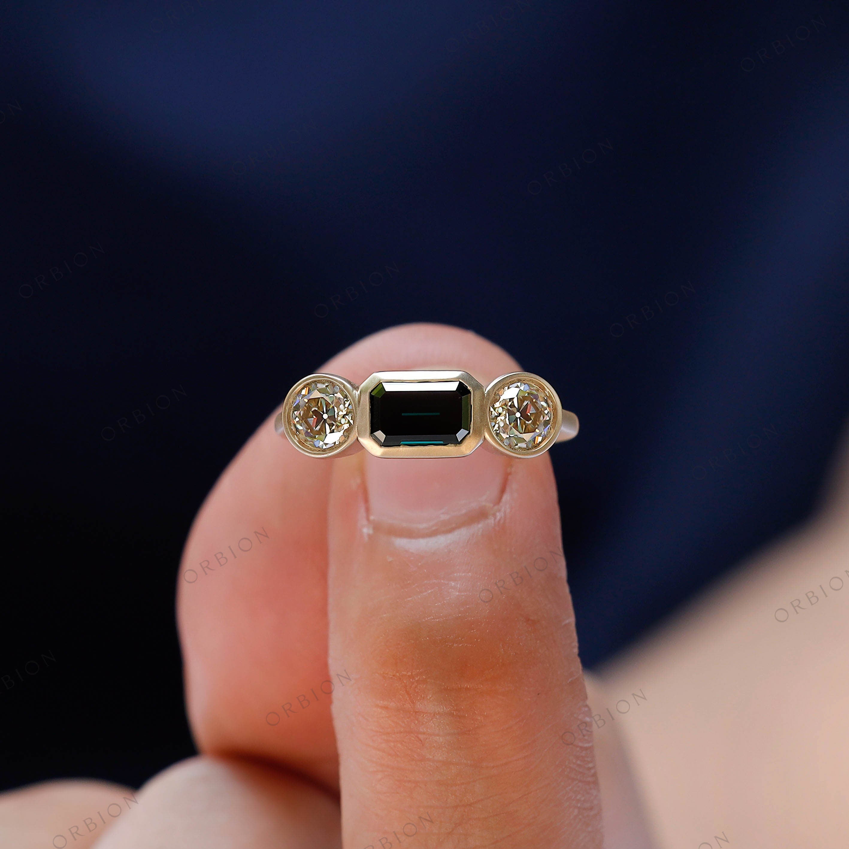 Bezel Set Old Mine Emerald Cut Moissanite Engagement Ring – Three Stone Green Moissanite Emerald Cut Design – 14K Yellow Gold Wedding Ring with Matte Finish