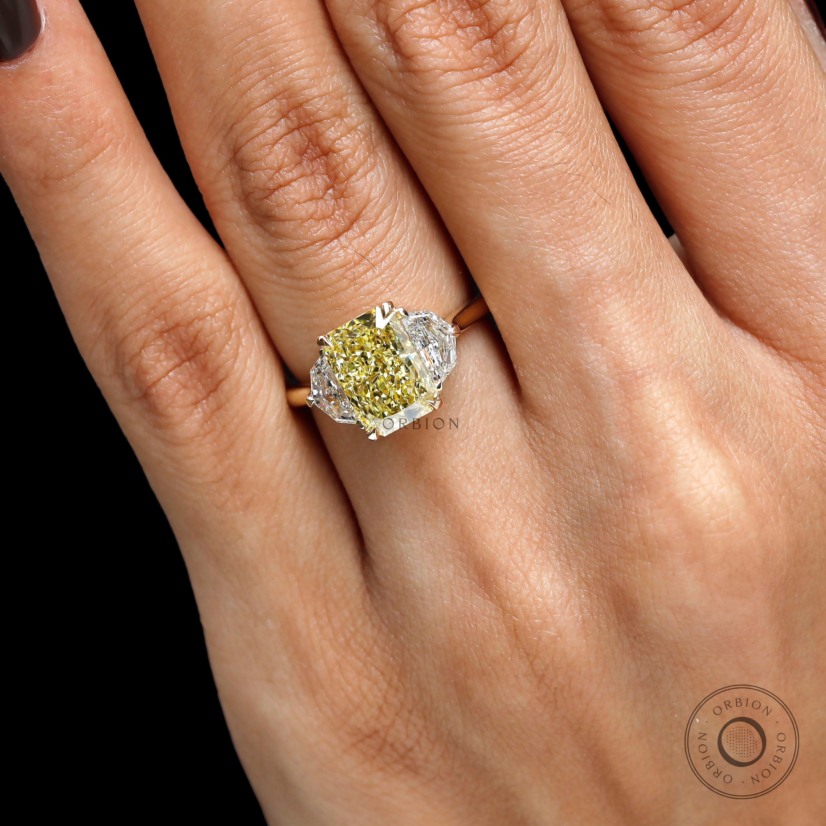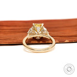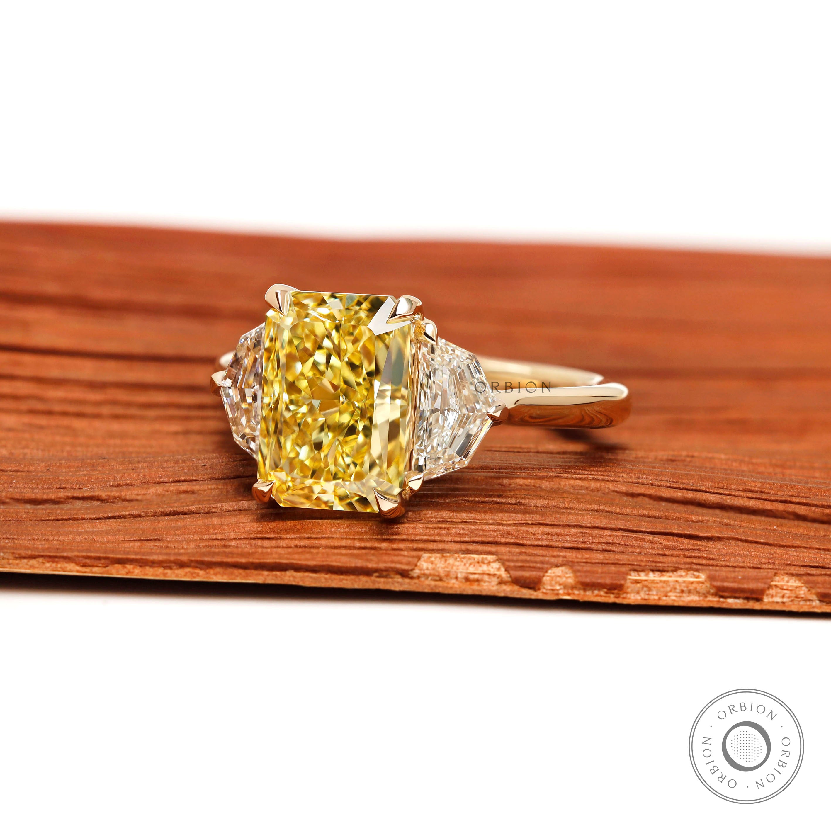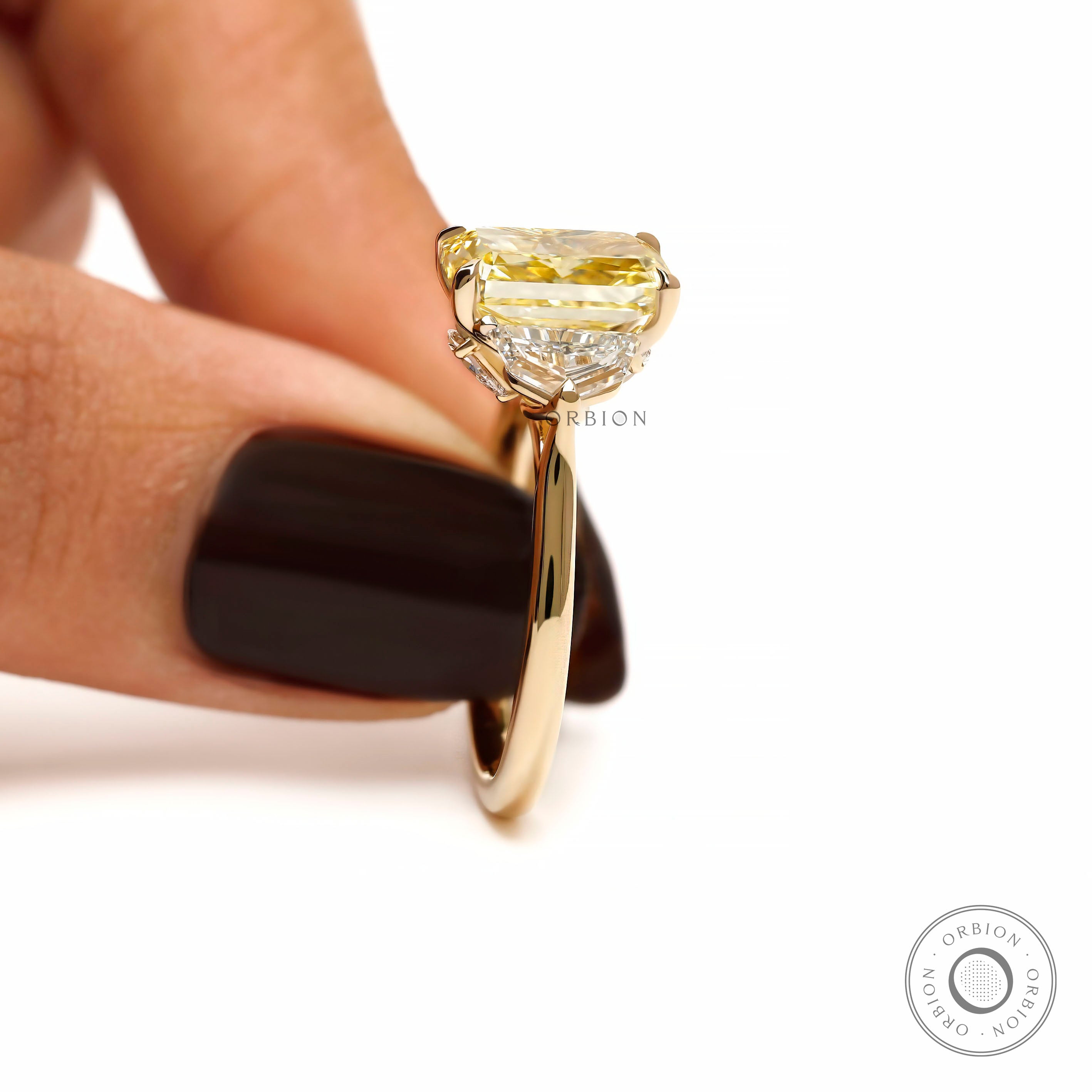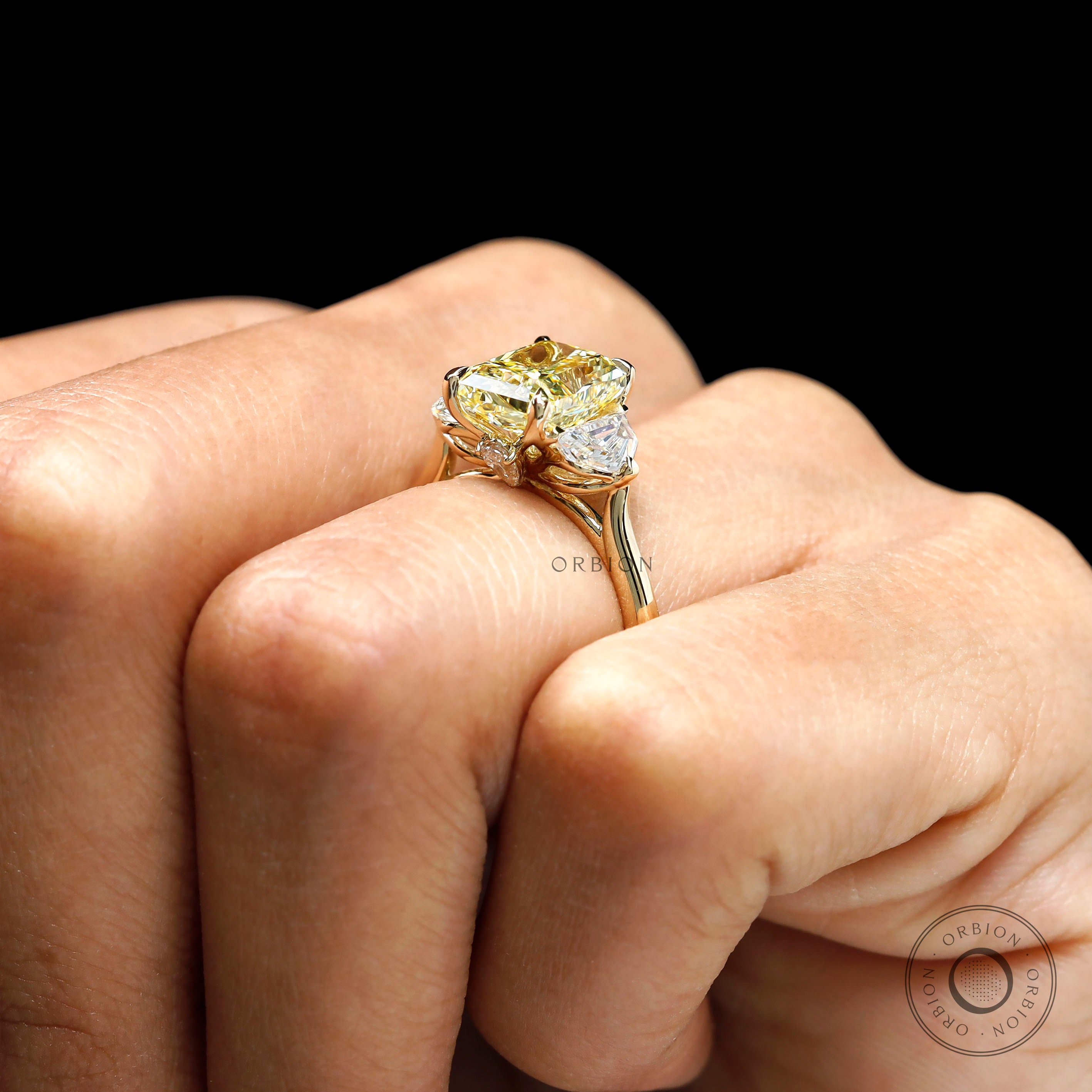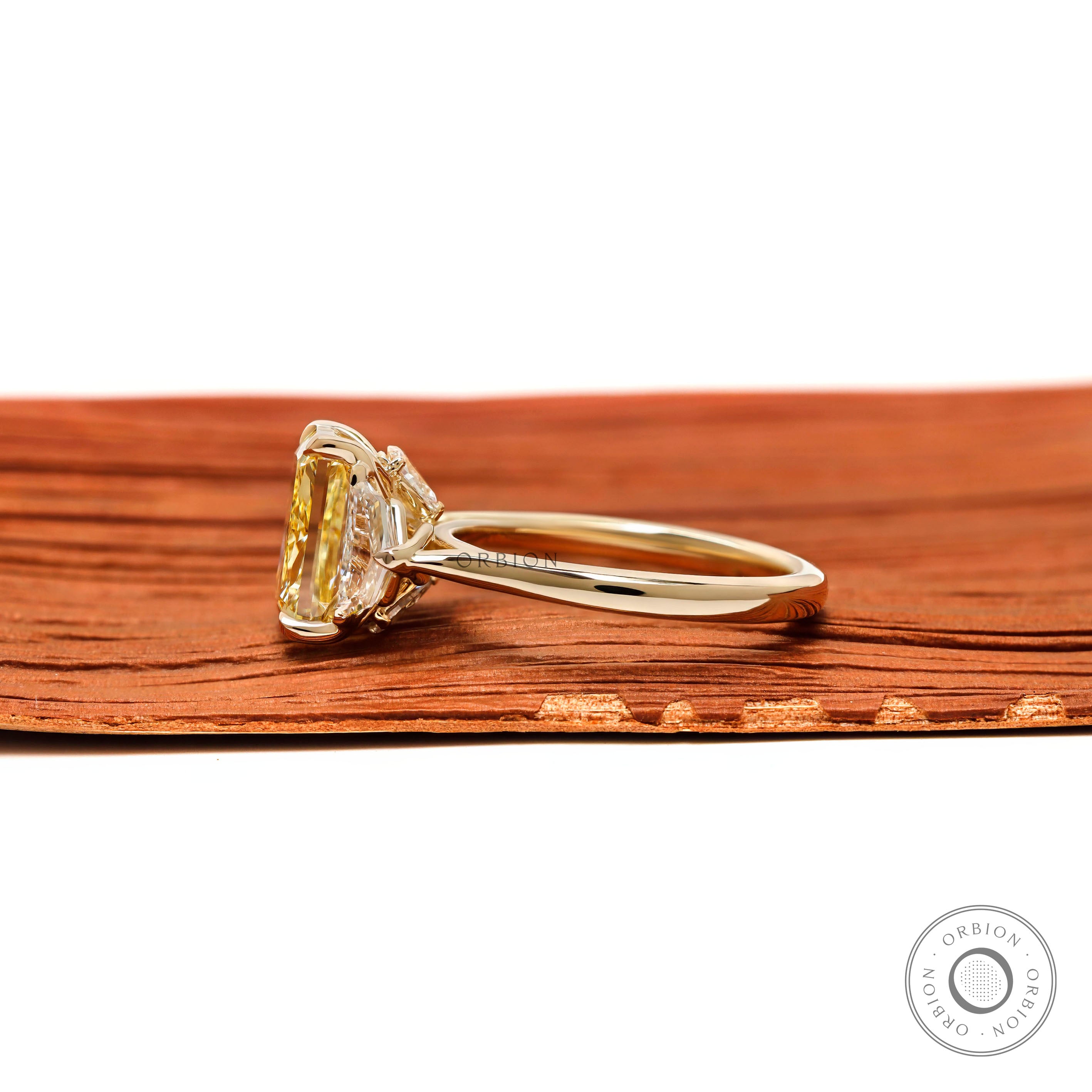 Yellow lab diamond wedding ring | Yellow lab diamond engagement ring | Yellow Lab Diamond Ring | 3 Stone yellow ring | Three stone lab diamond ring modern | Yellow engagement rings | Three stone lab diamond engagement ring | Radiant cut yellow lab diamond ring | Yellow lab grown diamond ring | Epaulette side stones ring | 14k Gold wedding rings | Unique bridal ring | Cathedral engagement trilogy | Cathedral engagement ring | Color diamond wedding rings | 1 Year anniversary gift.