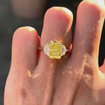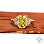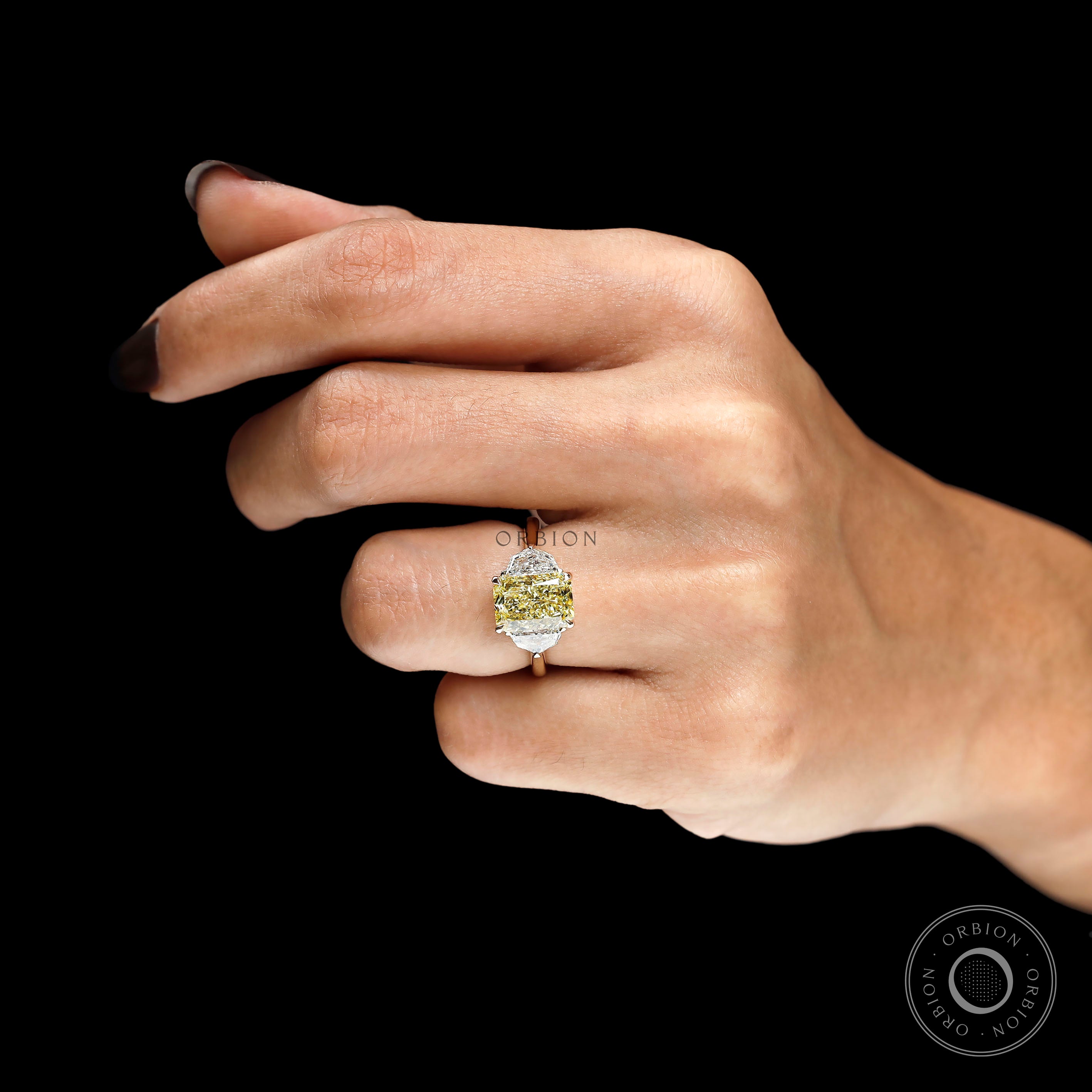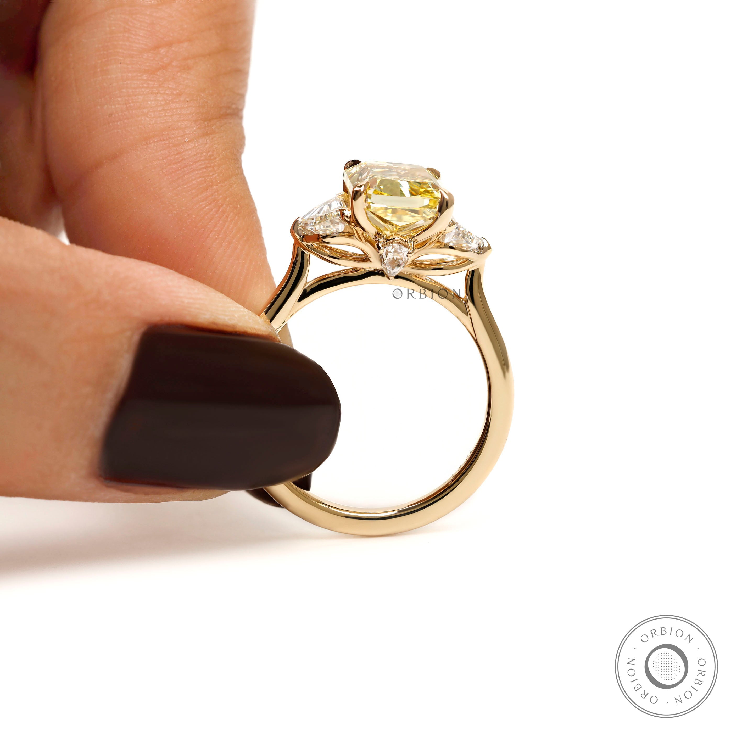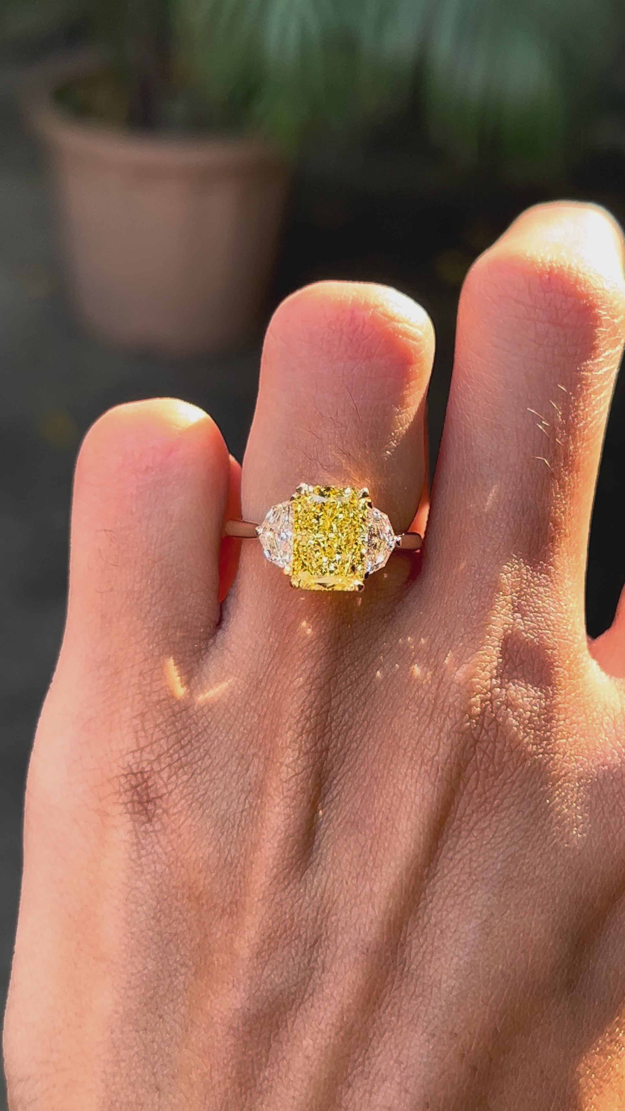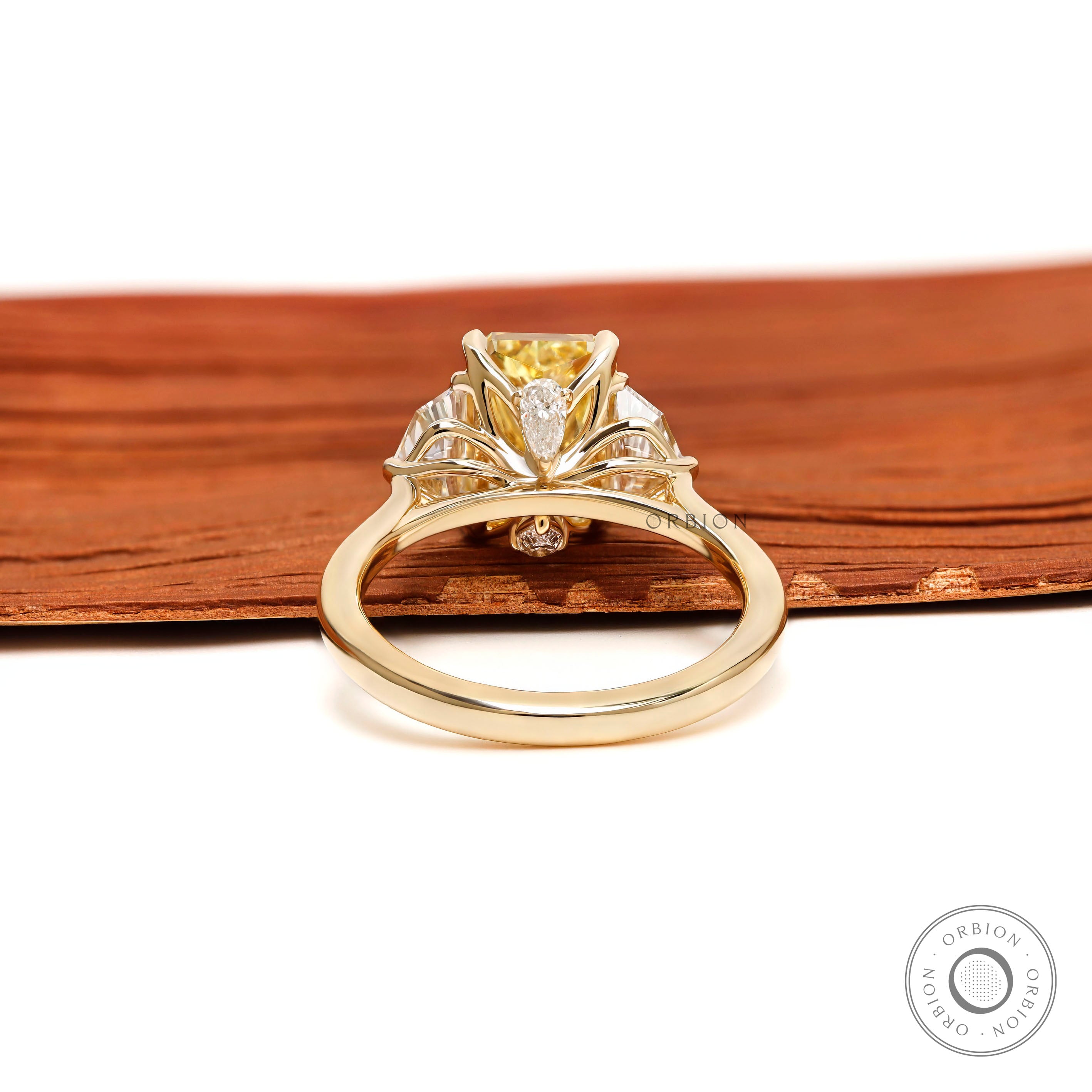 This exquisite three stone ring showcases a fancy intense yellow radiant cut lab grown diamond at its center, set in glowing 14K yellow gold. Flanked by unique epaulette cut and sparkling pear cut diamonds, the design offers a perfect blend of bold color, brilliance and modern elegance. The radiant cut amplifies the center stoneβs fiery sparkle, while the symmetrical side stones add artistic flair. This ring is a striking statement of individuality, ideal for those who seek luxury with meaning. A true showstopper, it's both timeless and refreshingly unique.