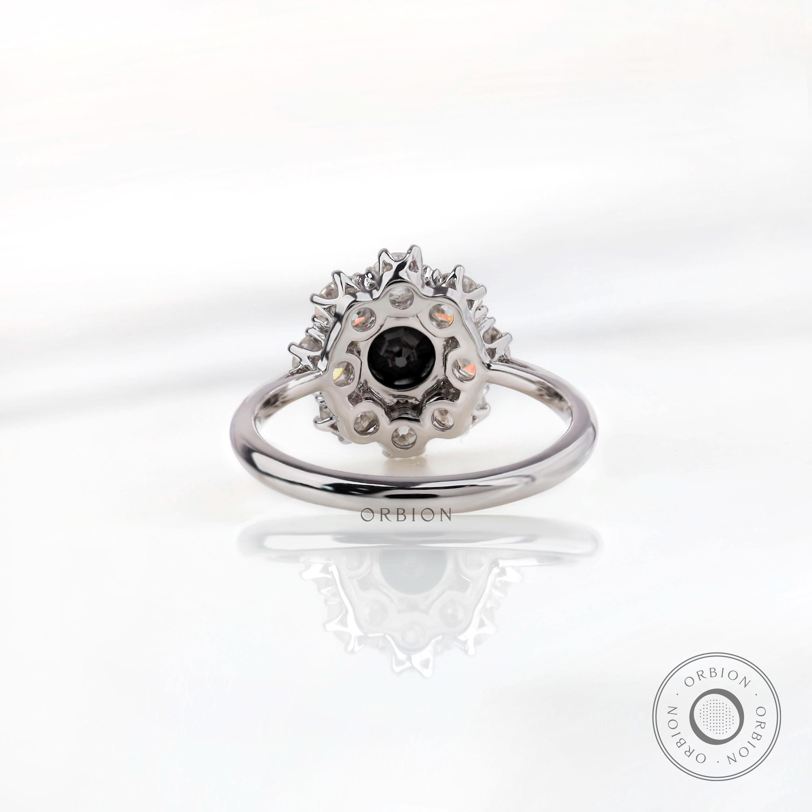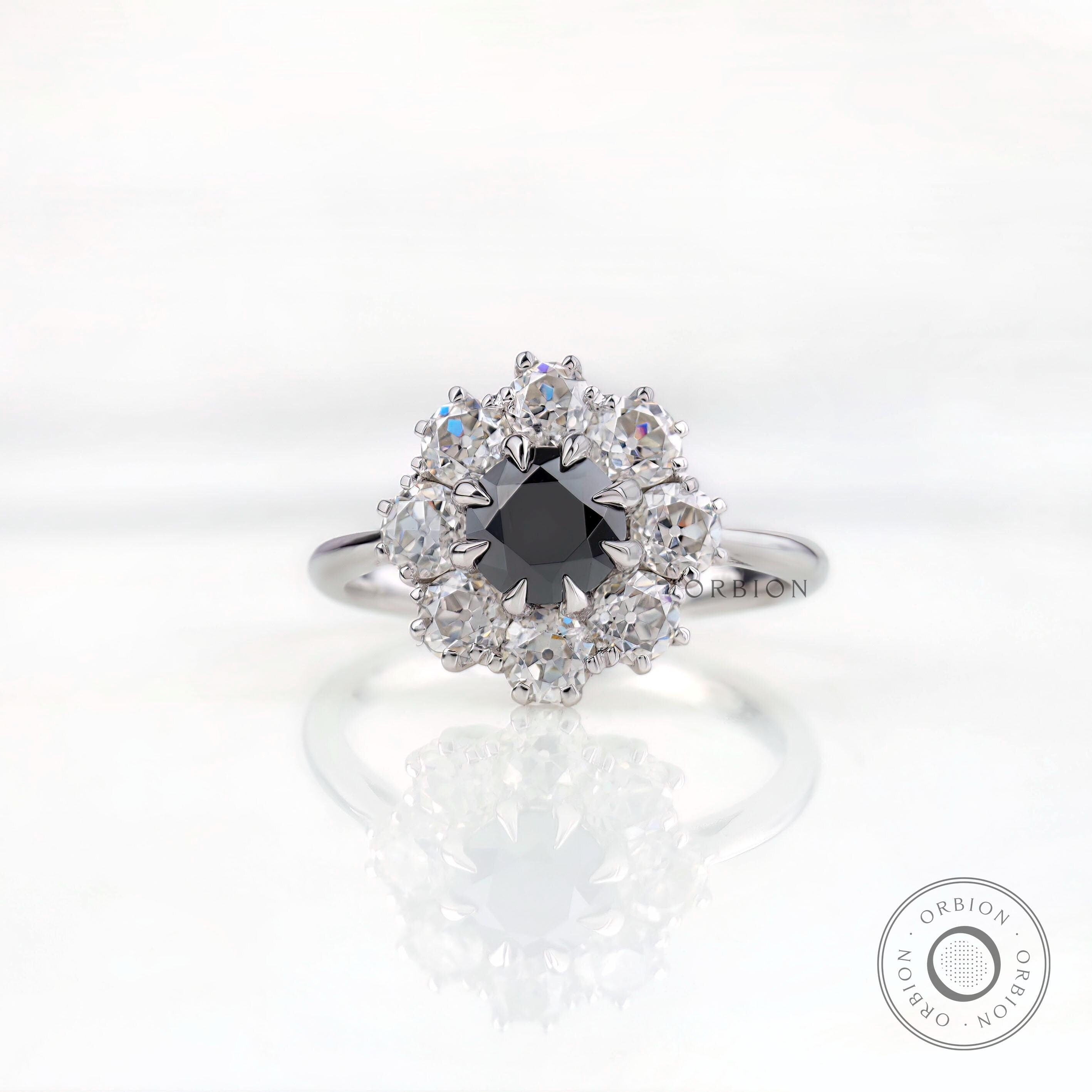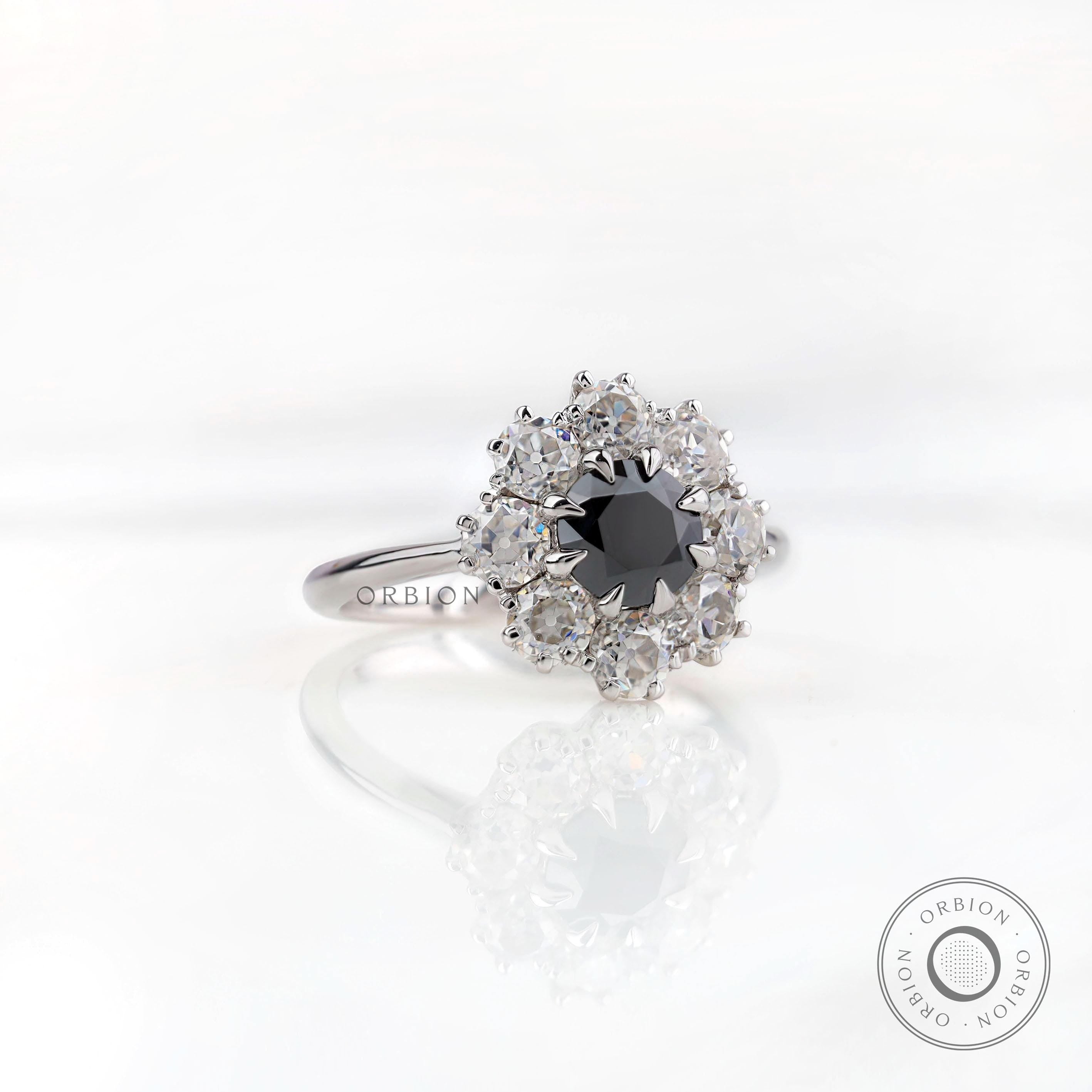 Vintage Black Moissanite Cluster Ring - Art Deco Style in 14K White Gold, 5.5MM Old European Cut, Unique Halo Engagement Ring, Promise Ring