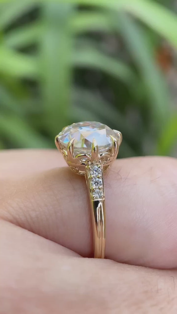 Embrace timeless elegance with this vintage-inspired engagement ring, featuring a brilliant Old European Cut round moissanite that sparkles with old-world charm. Meticulously crafted in luxurious 18K yellow gold, this romantic piece blends antique design with modern craftsmanship.